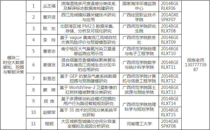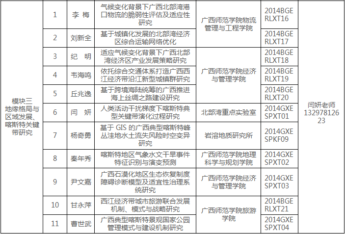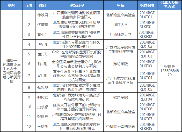 经2014年重点实验室学术委员会专家审定,结合实验室研究方向,将以下基金项目列入2014年北部湾环境演变与资源利用教育部重点实验室、广西地表过程与智能模拟重点实验室(广西师范学院)联合开放/系统基金项目,为规范实验室基金项目管理,将获批基金项目分为三大模块,每个模块由相应的召集人负责管理,现对获批基金项目予以公示,如有疑问请与各方向召集人联系。