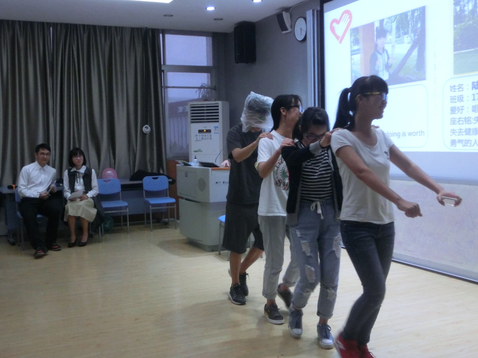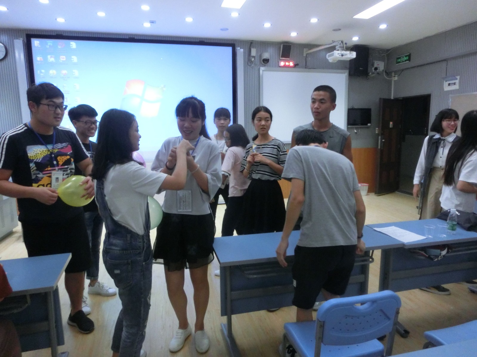 然后是游戏环节,游戏内容是两个人一小组,其中一个口中含水说其中游戏已准备好的一句话,另一个负责猜队友说的是什么。在场的同学都积极参加,在相互协作游戏中,干事们进一步认识了彼此。