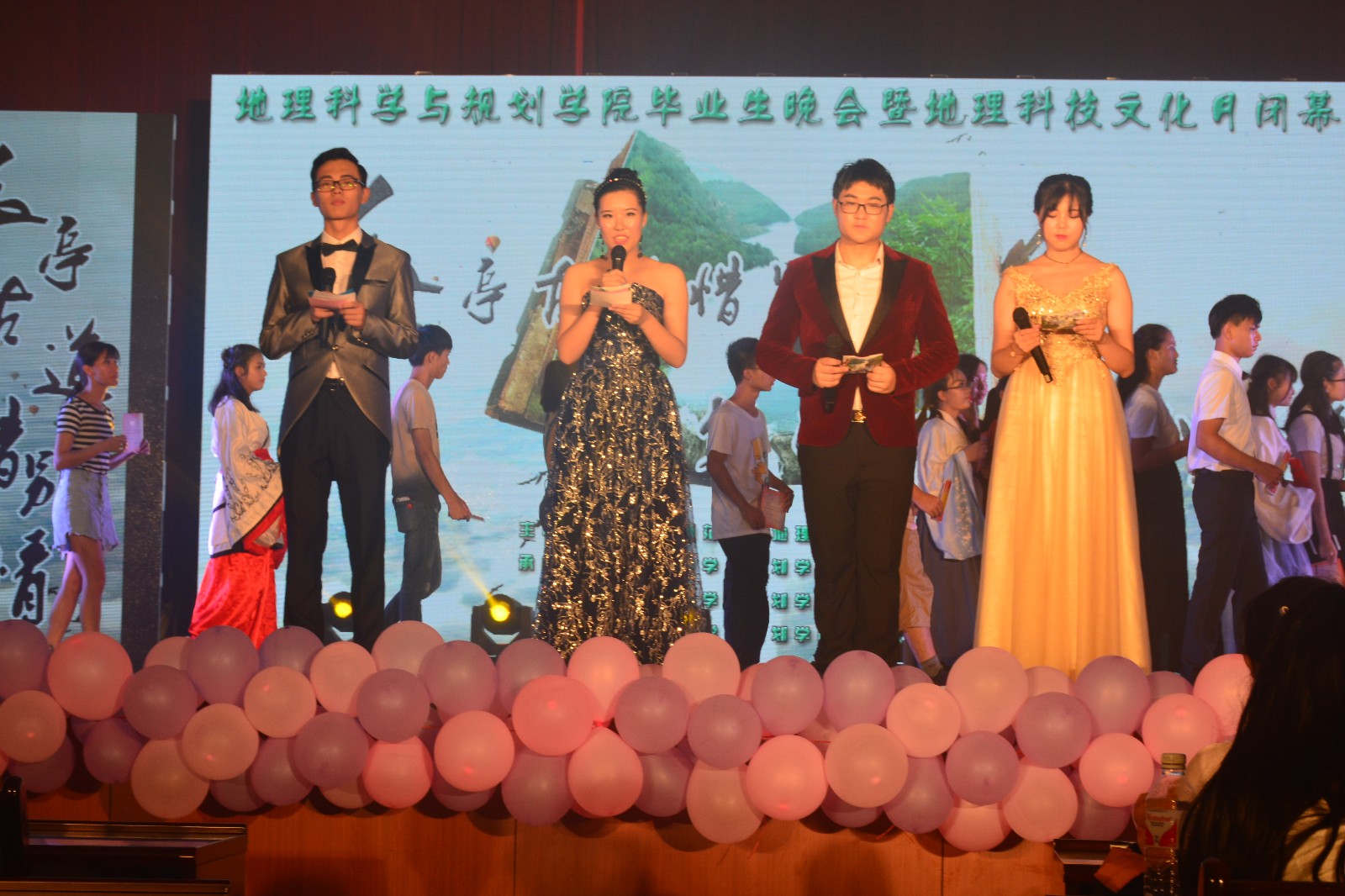 驿路漫漫欢人聚,风华正茂将别离,又是一年花开之际,又是一年毕业之时。为了给即将毕业的地理学子留下最美好的回忆,送上全院师生对他们最真挚的祝福,同时,也为了表彰在科技文化月中取得优异成绩的同学,地理学院于6月6日晚七点半在会堂举行了2018 年毕业生晚会暨第四届科技文化月系列活动闭幕式。莅临本次晚会的嘉宾分别有党委办公室副主任叶玉霞老师,学生工作部处副部处长林柳老师,计算机与信息工程学院辅导员乔学富老师,地理学院党委书记严志强老师与党委副书记韦立立老师,重点实验室张建兵老师,地理科学系副主任梁浩原老师,同时还有地理学院的全体学生。