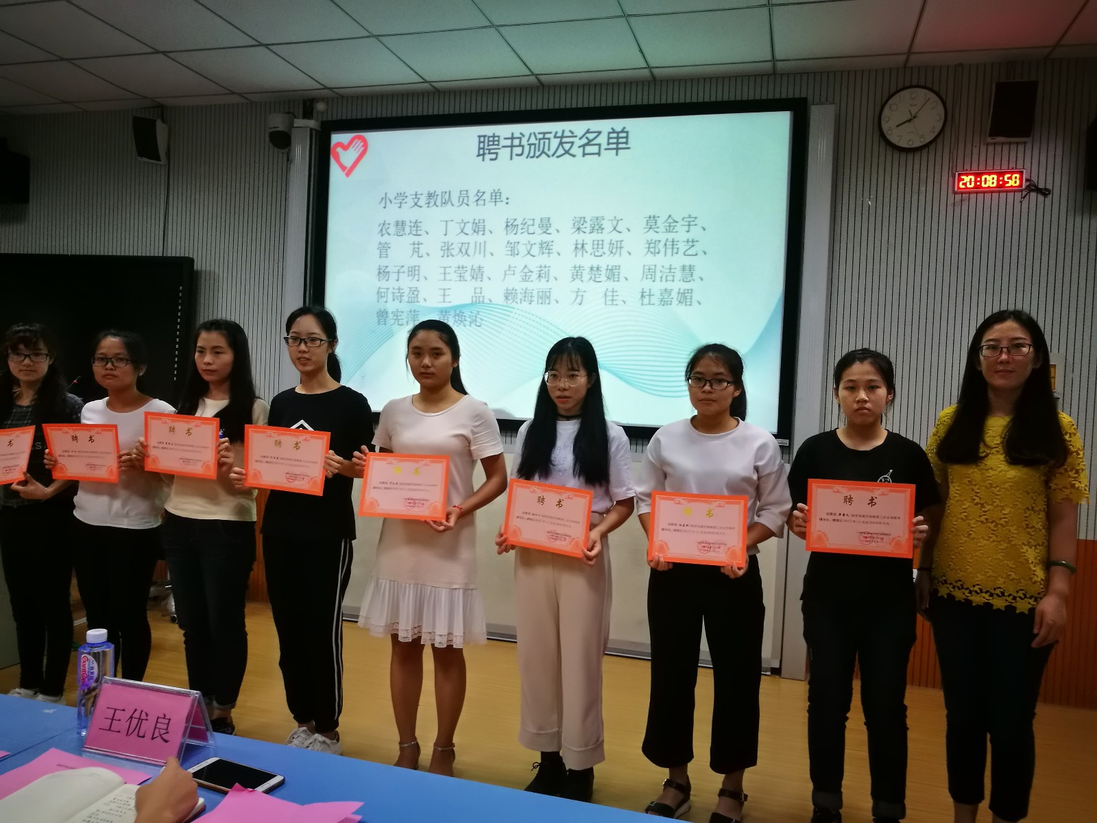 会议开始,首先由主持人介绍会议的流程,其次,由支教部部长做学年工作总结,谭金宇学长汇报了这一学年支教部的主要工作,并指出一些不足,以及提出整改方案。接着是学工办老师致辞:支教活动,是高校教育与基层教育的联合,是一次教育平台延伸的新尝试,是一个有着重要意义的活动,并对为我院支教活动提供了一个优秀平台以及众多帮助的南宁市明秀二区小学及师院附属幼儿园的领导和老师表示衷心的感谢;随后是幼儿园老师代表致辞,老师非常支持我们的支教活动,支教活动不仅让支教队员得到锻炼,也给孩子们带来了知识和欢乐,拓展了孩子们的视野,同时还给他们树立了一个良好的榜样,黄老师代表幼儿的全体老师和孩子们对支教队员们表示感谢。最后是支教队员代表管芃学姐发表感想,管芃学姐对小学老师和同学的支持表示感谢,在支教过程中也得到了许多锻炼,希望支教一直办下去。