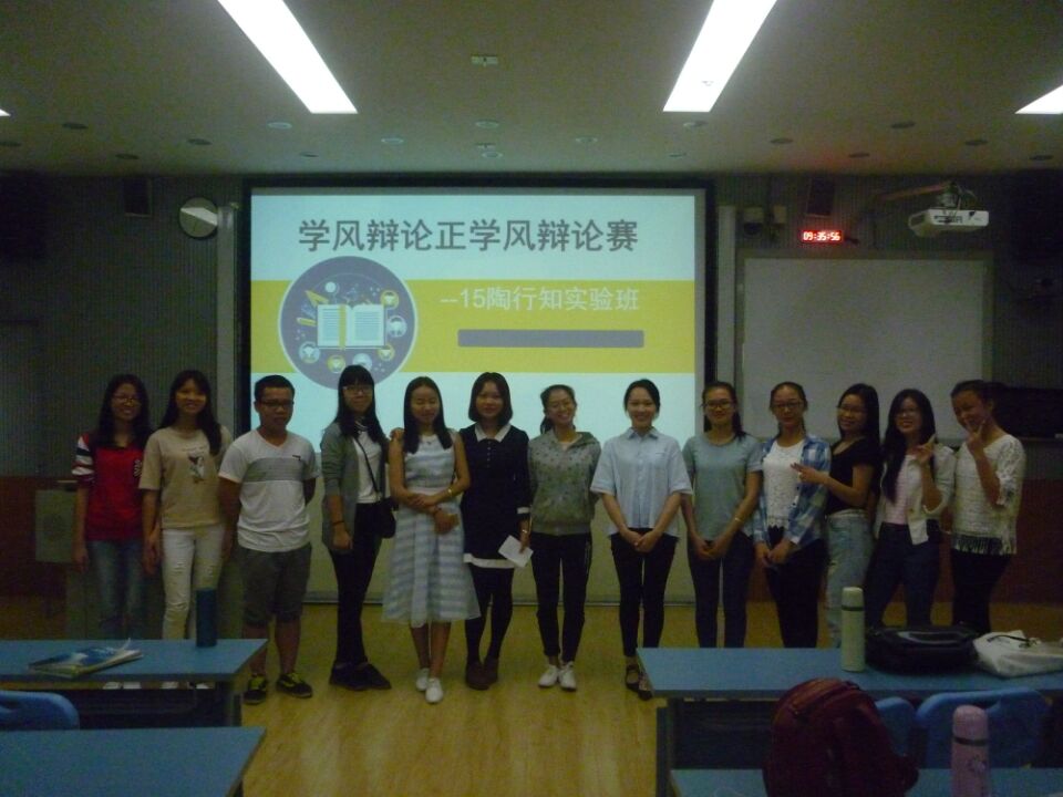 随着社会的不断发展和变化,我们对很多事情的认识也有所改变,在课余的时间里,为了让同学们更清楚的认识到事物的性质,丰富我们的学习生活以及个人的精神世界,增强我们的团结合作意识,培养大家的交流能力,为此,地理学院15陶行知实验班于2016年11月16日在文星楼414举行了一场以“学风建设重在思想还是重在行动”为主题的辩论赛,其中正方认为学风建设重在行动,反方认为学风建设重在思想。除了15陶行知实验班的全体同学之外还有两位学习部的同学也参与到辩论赛中。